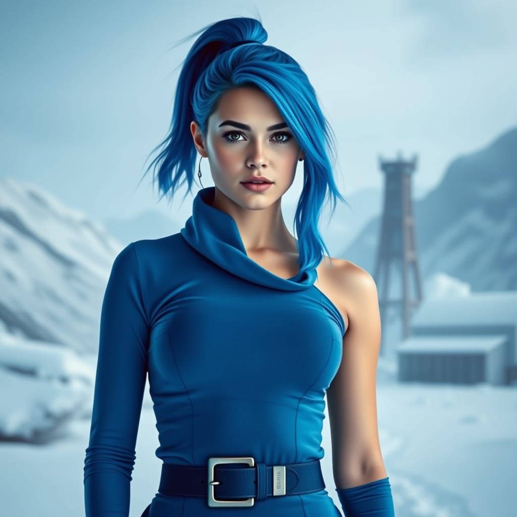 This image shows a confident young woman standing in a serene snowy landscape, surrounded by icy mountains and a tower, bathed in soft blue tones. Her bright blue hair and form-fitting outfit exude determination and style.
