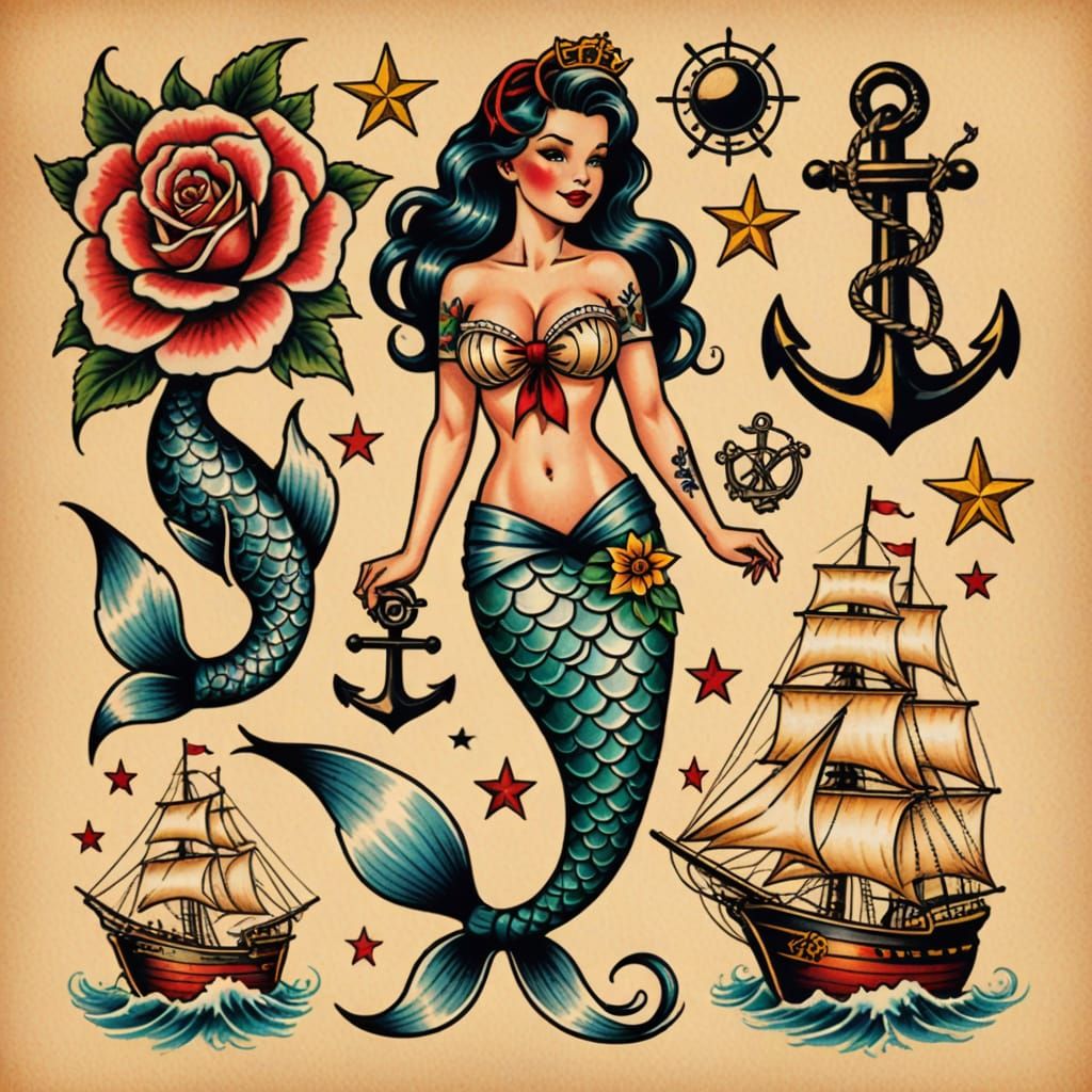 This image shows vintage sailor tattoos on skin. A medium shot captures classic tattoo art with bold black lines and bright colors. Iconic mermaid and anchor designs are visible in a traditional style.