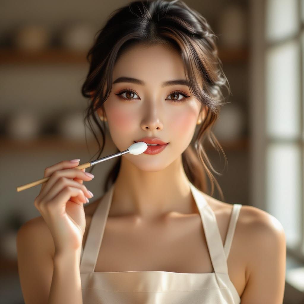 Cinematic close-up of a confident Asian woman with flawless skin and a hint of a smile, holding a piping tip. Features dramatic Rembrandt lighting and a 3D anime art aesthetic.