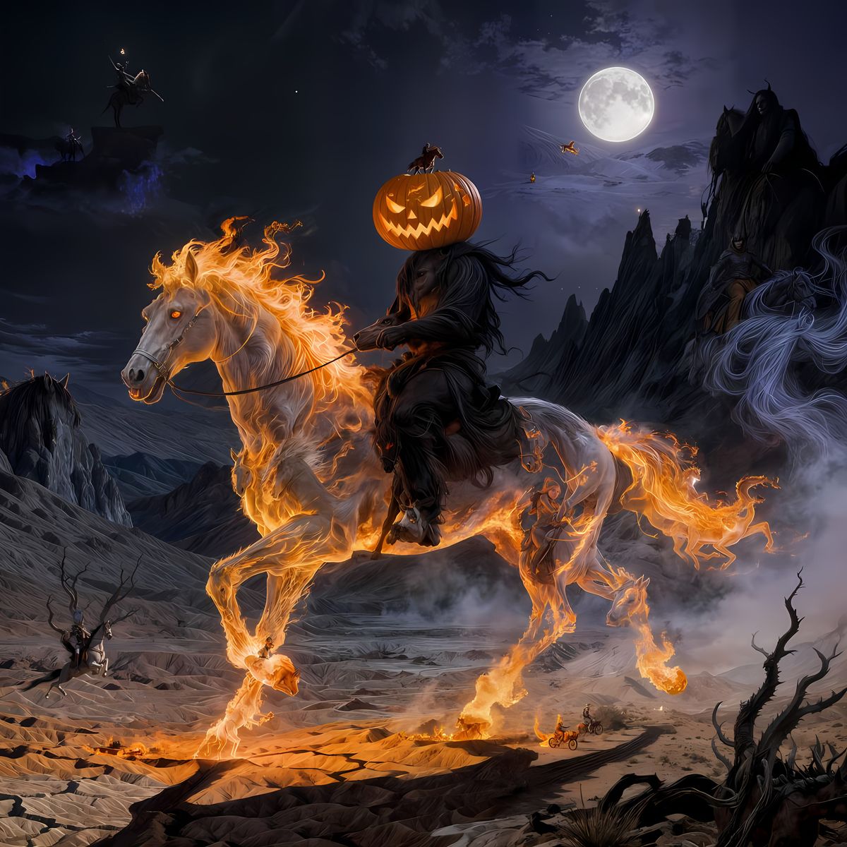 This image captures a surreal scene of a pumpkin-headed figure astride a flaming ghost horse, galloping through the desolate landscape of Death Valley.