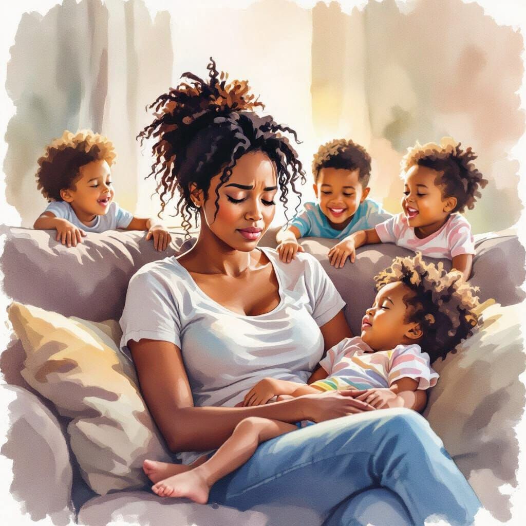 This watercolor painting captures a tired Black mother on a couch, with energetic children in the background. Features visible brushstrokes and soft, bleeding colors for a gentle, loving feel.