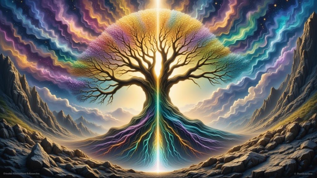 A captivating image of mountains merging with a spiritual dimension. A crystalline Tree of Life rises from the terrain, its branches reaching into layered dimensions. The artwork features fractal patterns and light rivers, in an ultra-realistic fantasy style.