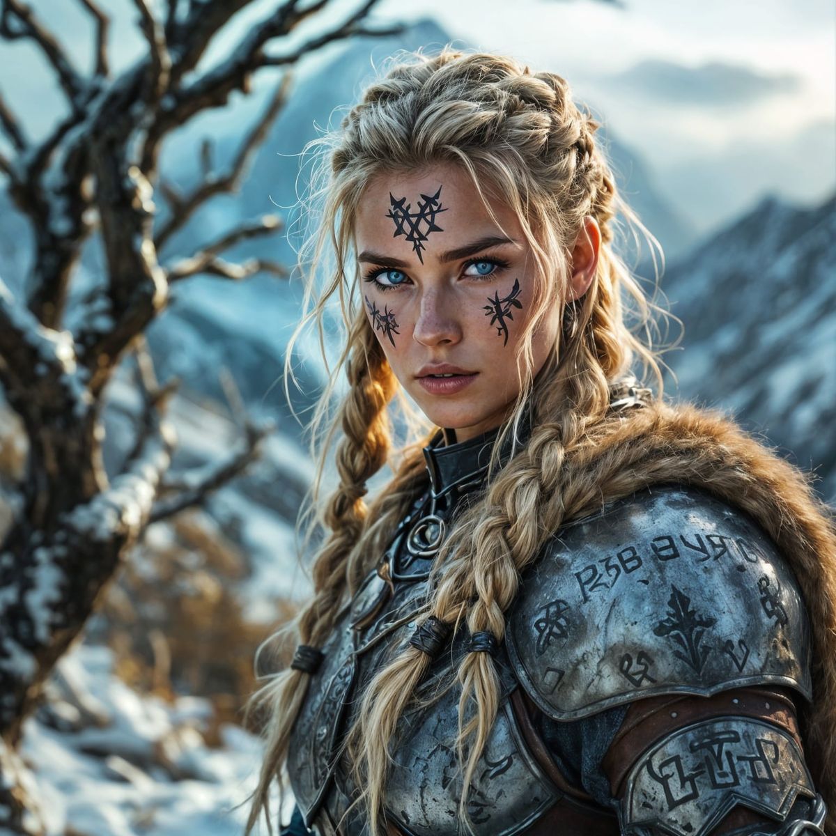 A striking Viking warrior stands resolute under a snow-encrusted tree, clad in battered silver armor adorned with Norse runes. Her bold black Celtic-inspired tattoos dance across her cheeks and forehead, set against the dramatic, turbulent sky and snowy mountain range.
