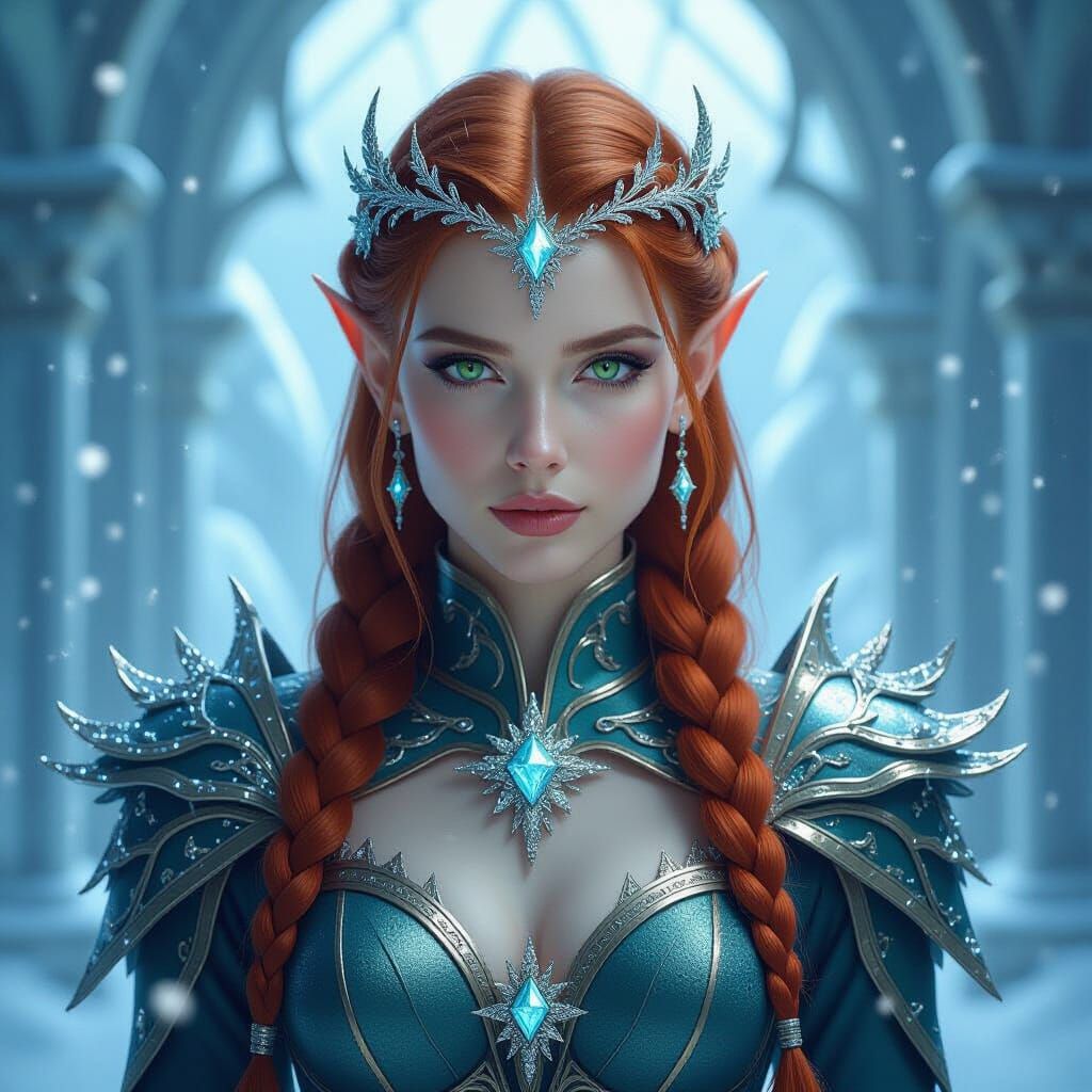 A majestic elven queen stands in her crystal palace. She has long braided red hair, piercing green eyes, and wears ornate diamond armor. Digital art with hyperrealistic rendering.