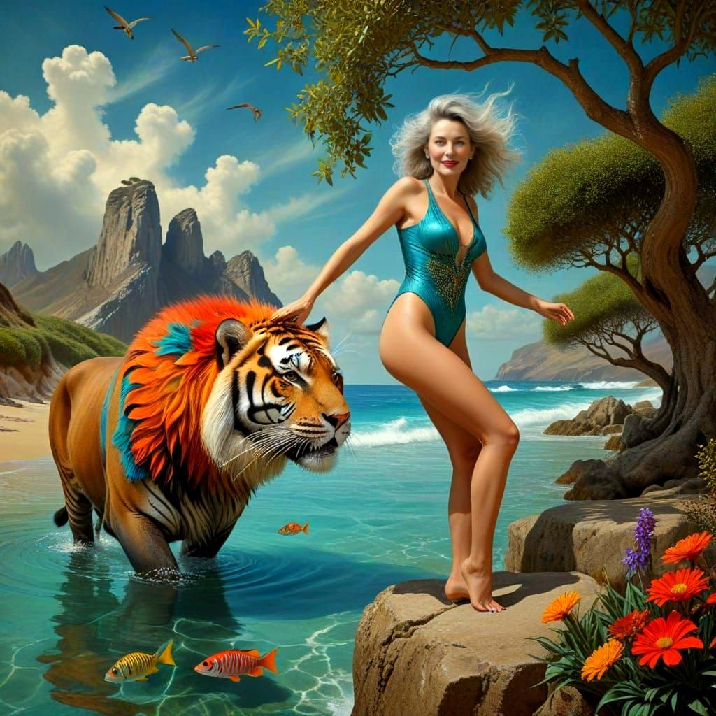photorealistic charming happy mature lady with fantastic animal in strange fantastic surrealistic scene by Susan Seddon Boulet, Catrin Welz-Stein, Dorothea Tanning, Johfra Bosschart, Max Ernst, Salvador Dali, Paul Delvaux, Rene Magritte, Andy Kehoe, Giorgio de Chirico, fantasy, surrealism, photorealism, ...