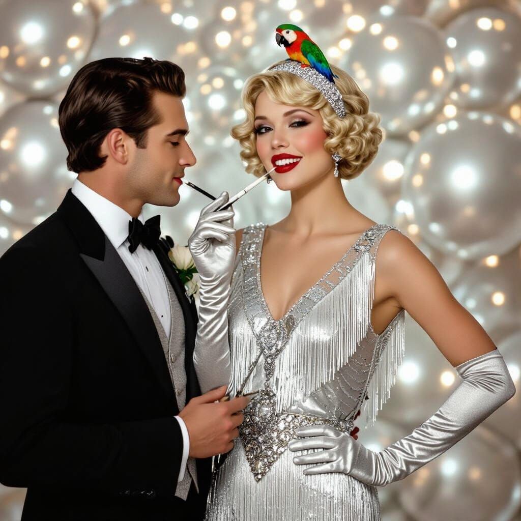 A flapper in a silver fringed dress is offered a light. The image evokes the elegance of the Art Deco era, with sleek lines and ornate details.