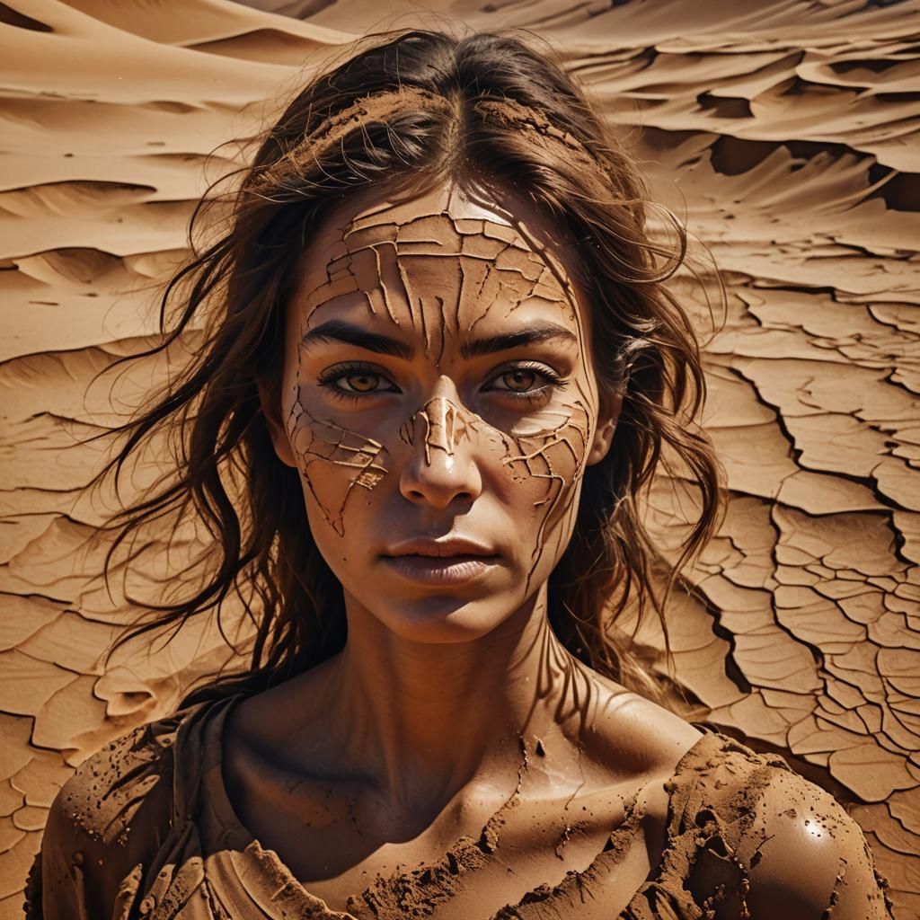 A striking picture of a woman's face blending into a desert landscape. The image features detailed, realistic textures, rich earthy tones, and warm sunlight, rendered as digital art.