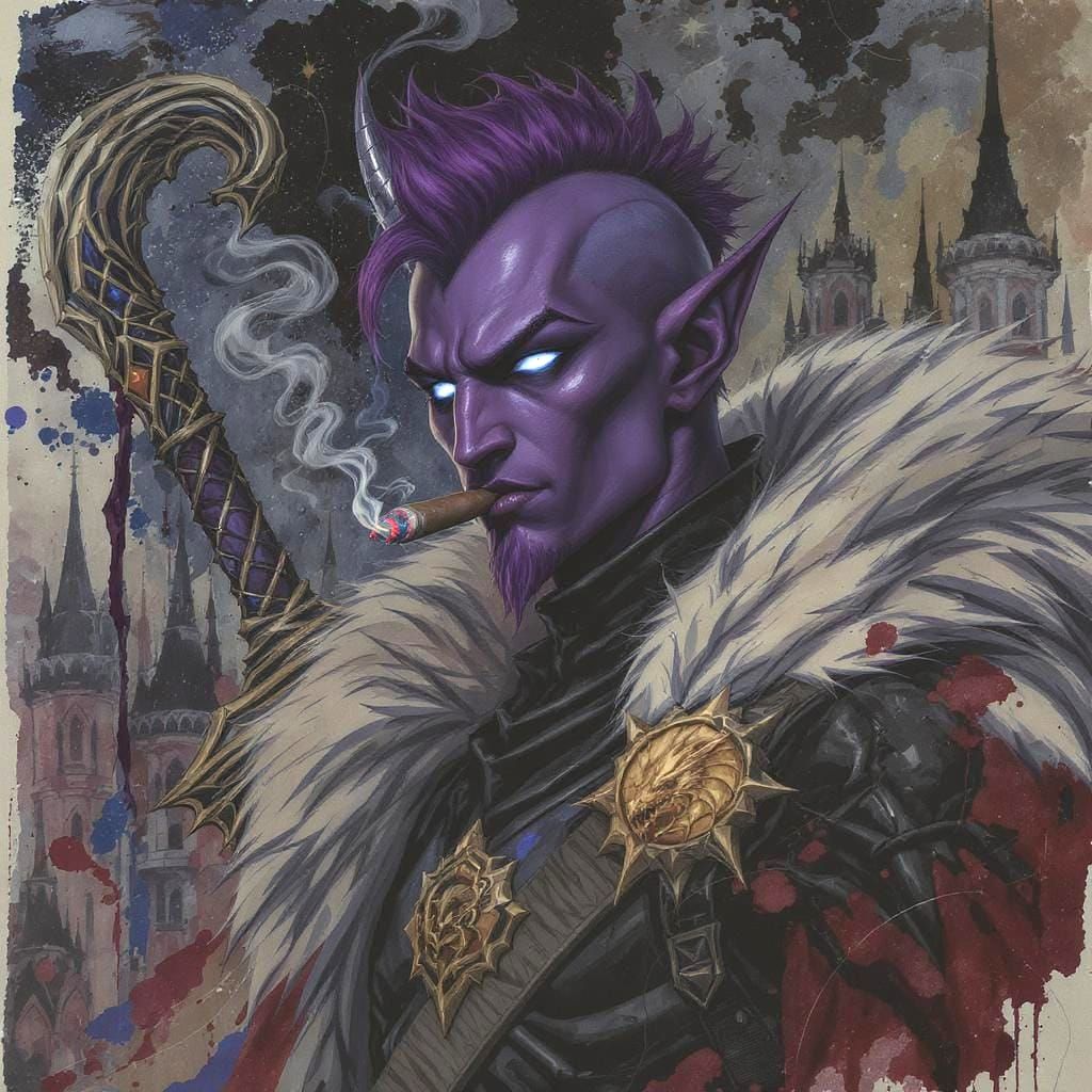 A charcoal sketch of a handsome, purple-skinned tiefling with a mechanical eye, smoking a cigar. He wears black leather armor and a white fur cloak, rendered with moody watercolors in an art nouveau style.