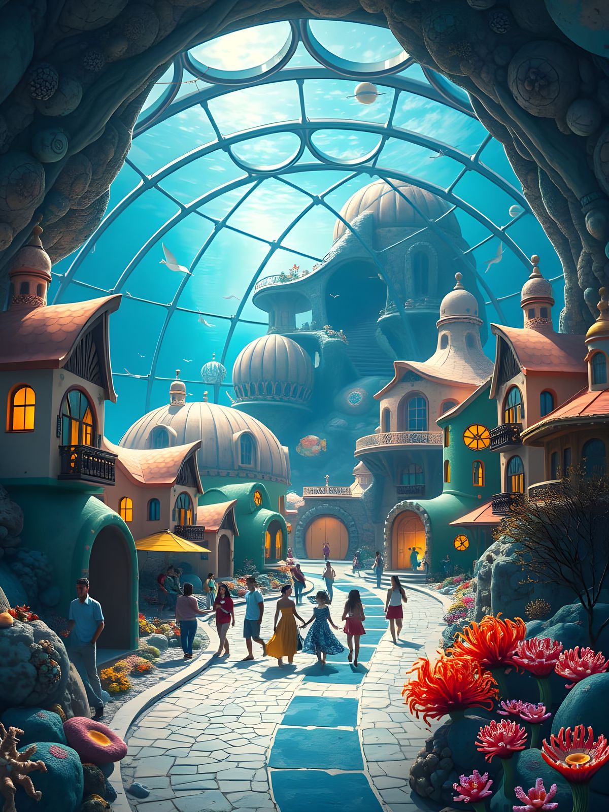 This image shows a vibrant underwater city inside a protective dome. Cobblestone streets are lined with colorful homes in an organic architectural style, depicted as a digital painting.