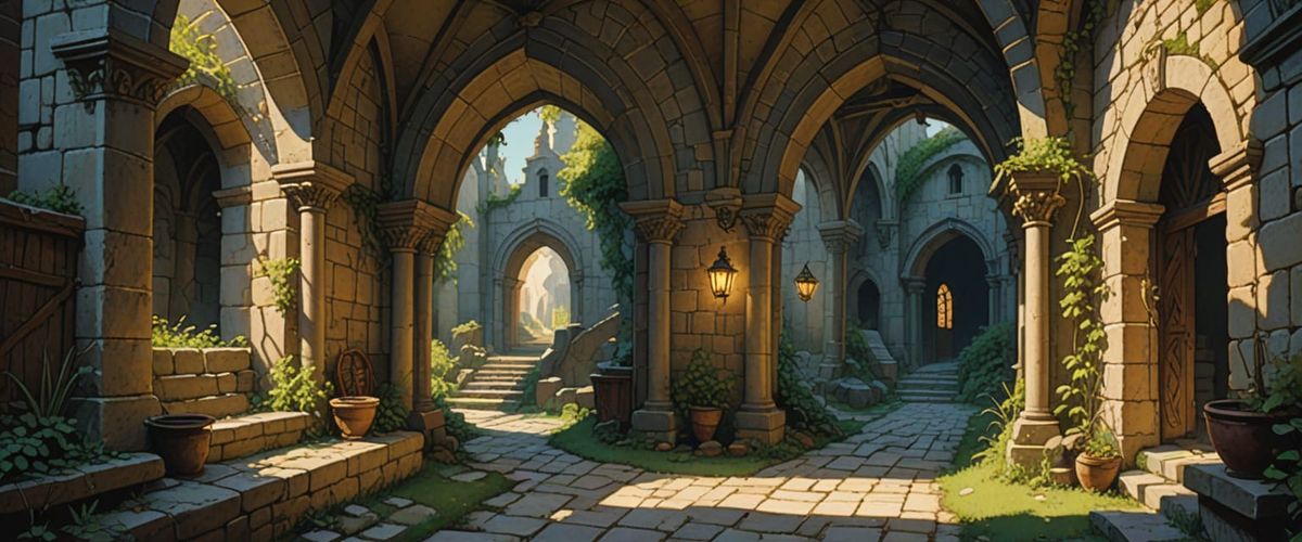 This image shows an abandoned passageway within a castle or monastery, filled with stone walls, arches, and doorways. The scene is rendered with bright, cheerful colors and volumetric lighting, reminiscent of watercolor and gouache techniques.
