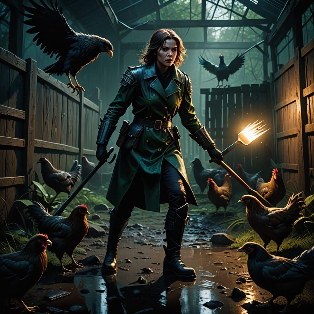 A dark fantasy scene of a fierce mom in rubber boots, wielding a shovel, as she confronts a menacing mink in a chaotic chicken pen. Moody, cinematic lighting and a vivid color scheme create an eerie atmosphere.