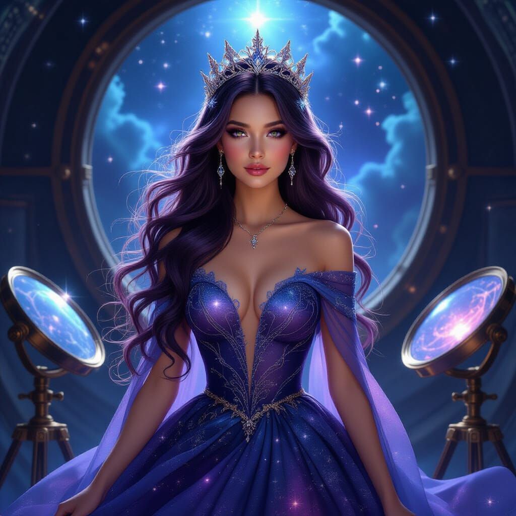 A striking picture of a serene enchantress with flowing amethyst hair and a starlight crown. She stands in an observatory surrounded by telescopes, wearing a gown of nebulae in a hyperrealistic style.