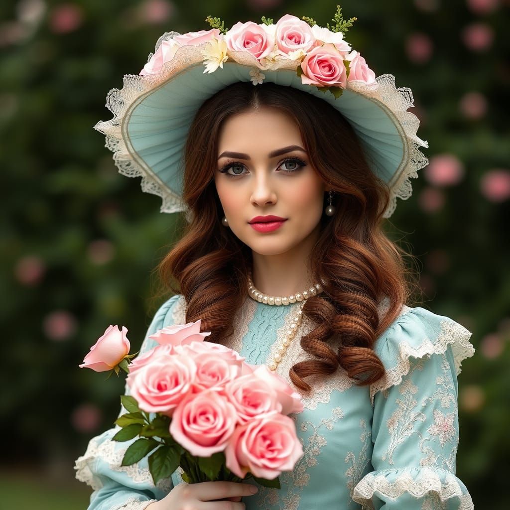 This image shows a woman in Victorian-era dress, complete with lace, roses, pearls, and an elaborate hat. Soft focus and pastel colors enhance the romantic, refined aesthetic.