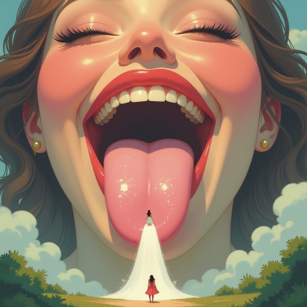 This image depicts a colossal, kind woman holding a minuscule woman on her tongue, creating a slide towards her open mouth. Rendered in a storybook style with soft lighting and warm colors.