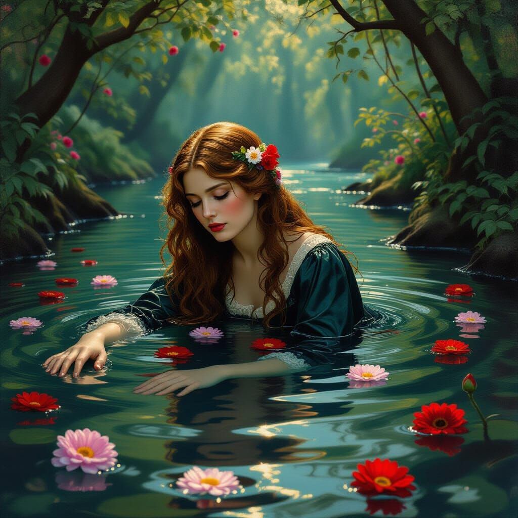 This image depicts Ophelia, submerged in a river and encircled by vibrant flowers, rendered in a dramatic Pre-Raphaelite painting style with rich, symbolic colors.