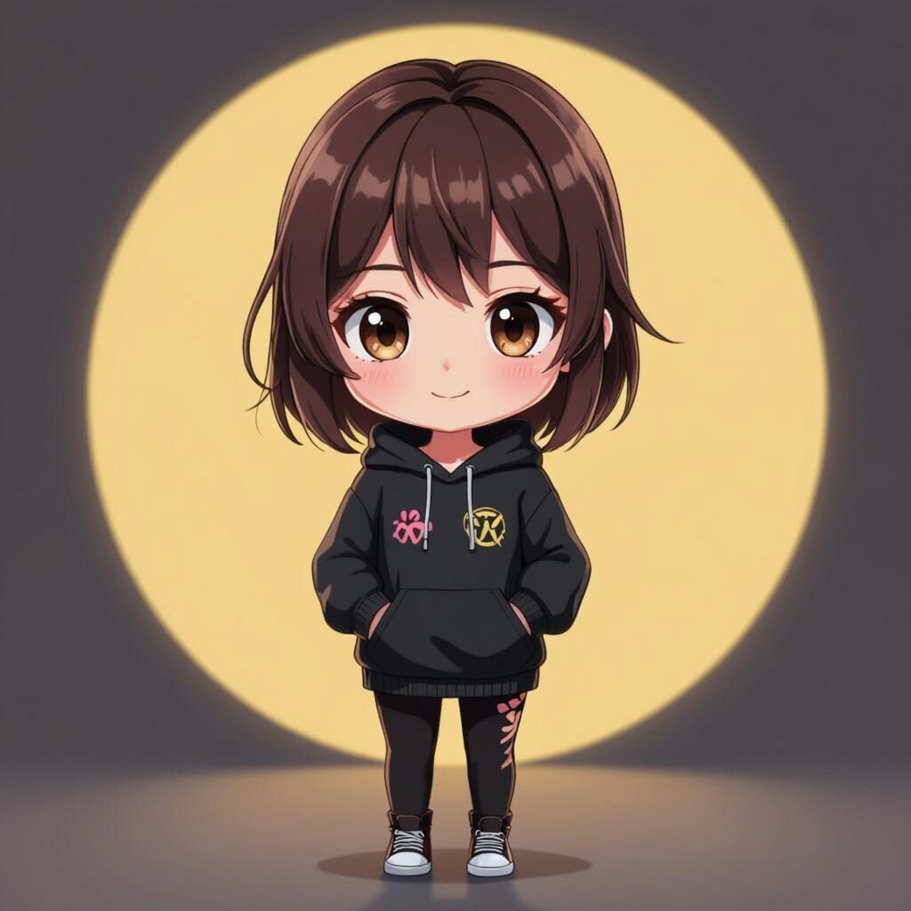 This 3D anime art depicts a detailed character with dark brown hair and eyes, wearing a black hoodie and pants, with subtle pink and yellow highlights.