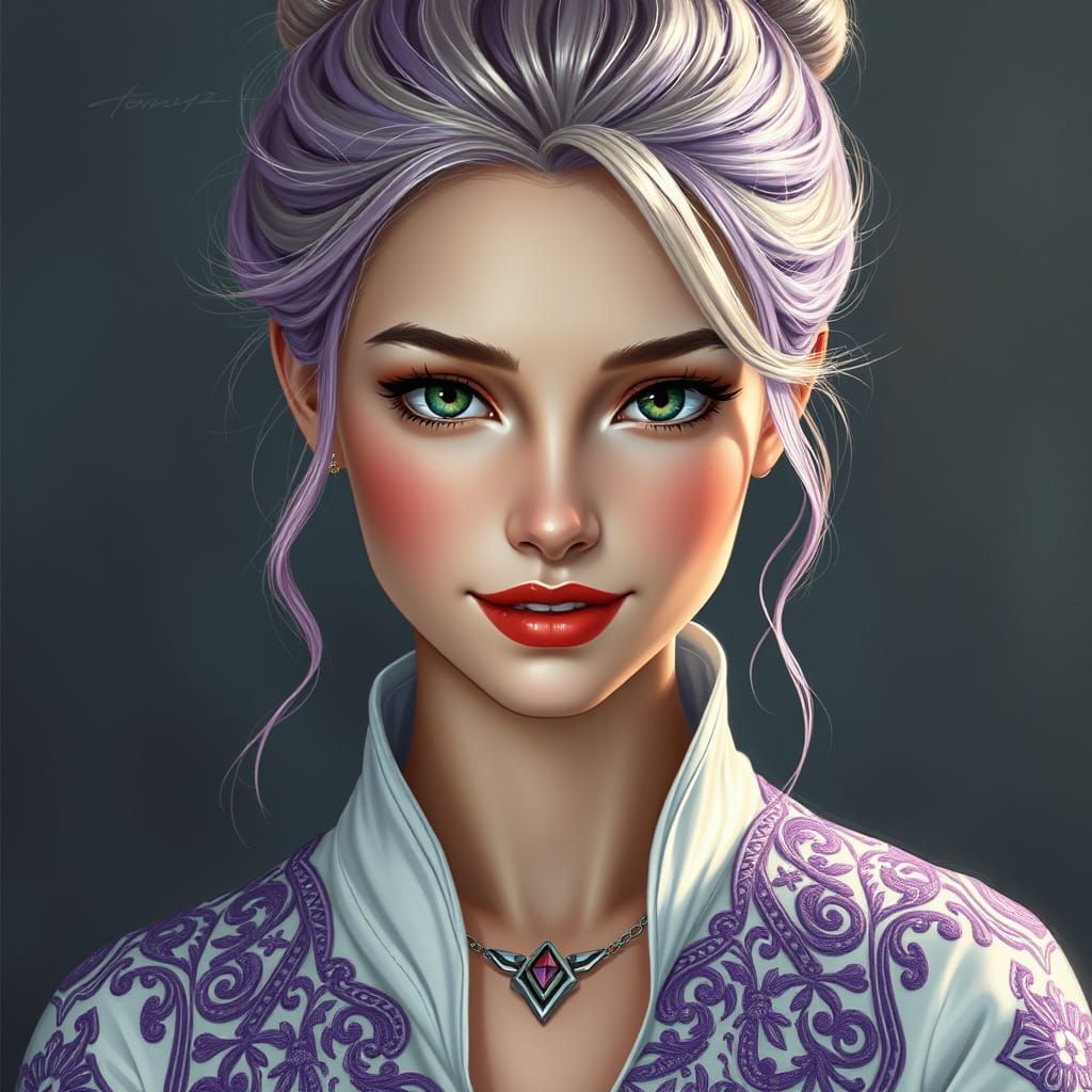 close-up portrait of a stunning young woman with a charming smile and blonde-purplish hair styled in a high bun. Her piercing blue-green eyes and full red lips draw immediate attention, while she wears a white outfit adorned with intricate purple-silver patterns and a delicate silver necklace.