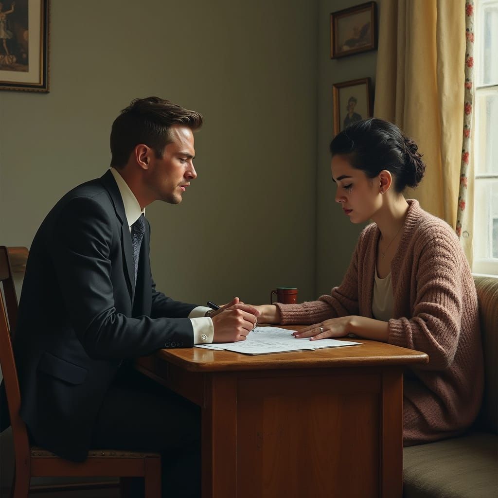 A poignant image of a man working at a desk while a woman weeps on a nearby couch. The scene evokes a raw emotionality with muted tones and expressive brushwork.