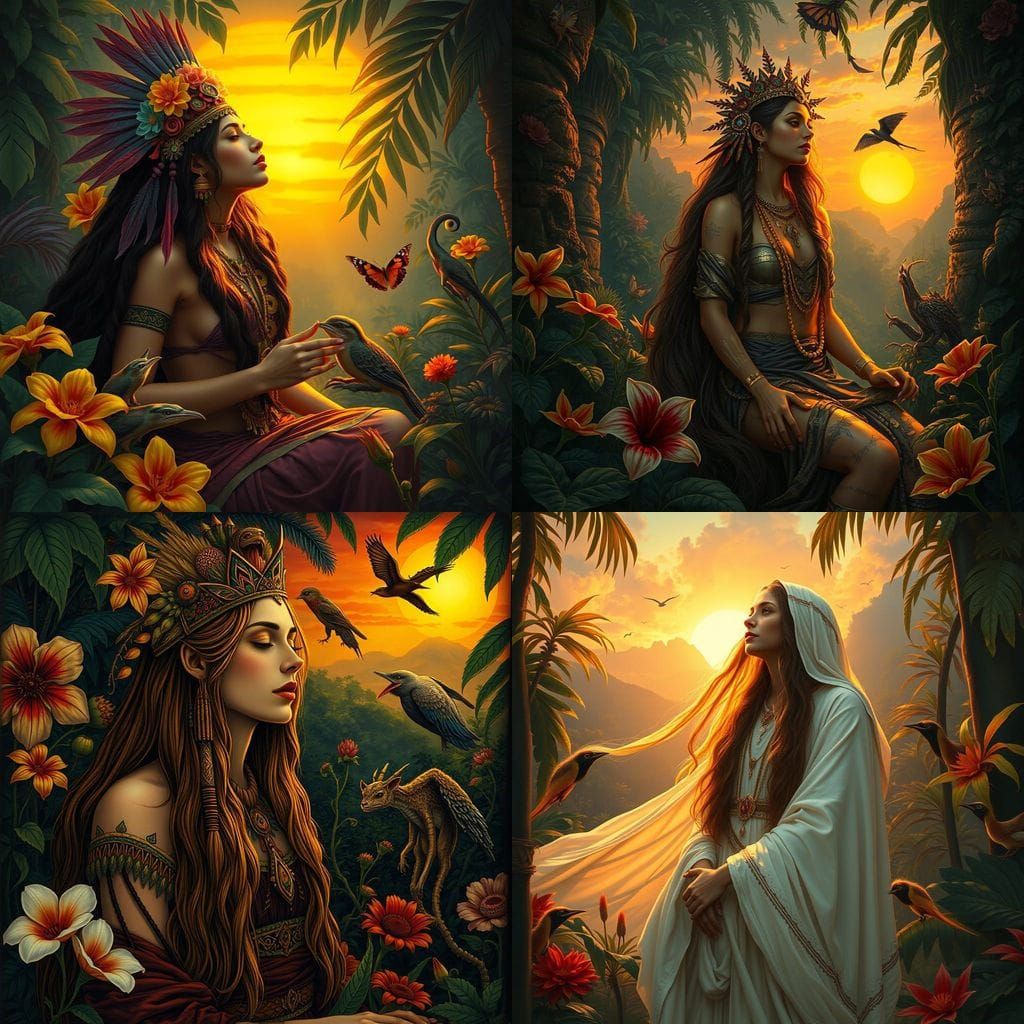 A tranquil image of a lost Inca city nestled in a vibrant jungle, teeming with exotic flora and fauna. An Inca priestess dreams in the setting sun, rendered in a pre-Raphaelite style.