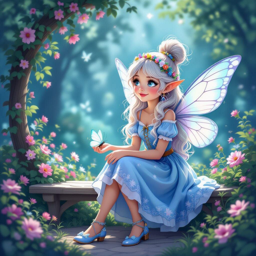 A whimsical fantasy fairy with rainbow hair and a hydrangea crown sits happily with a butterfly. The scene is set against a magical, sparkling background with nature elements.