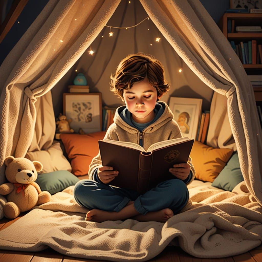 This image shows a child engrossed in reading within a magical, inviting blanket fort. It features soft textures, warm hues, and diffused lighting, creating a cozy atmosphere.