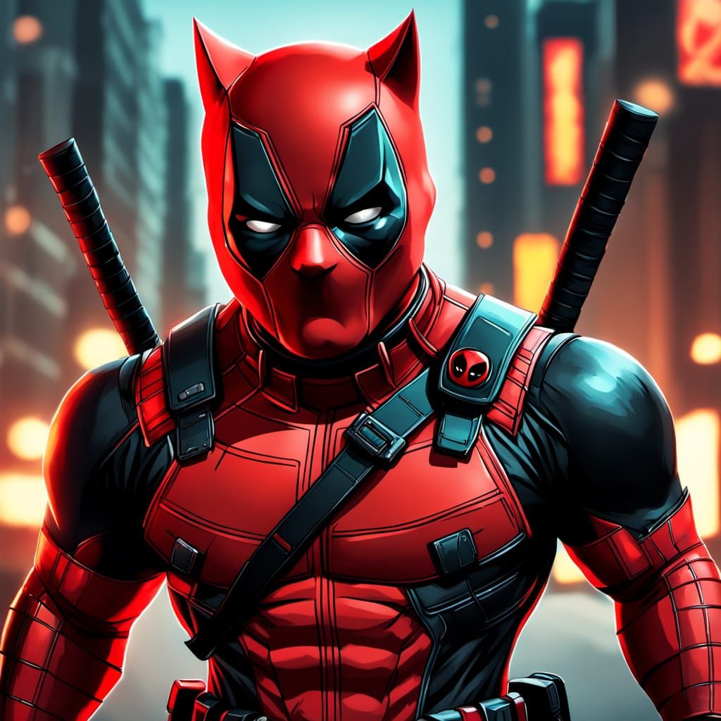 A medium shot digital painting of an overweight cat dressed as Deadpool. This artwork is cartoonish and humorous, rendered in a comic book art style with vibrant red and black colors, dynamic shading and glowing eyes.