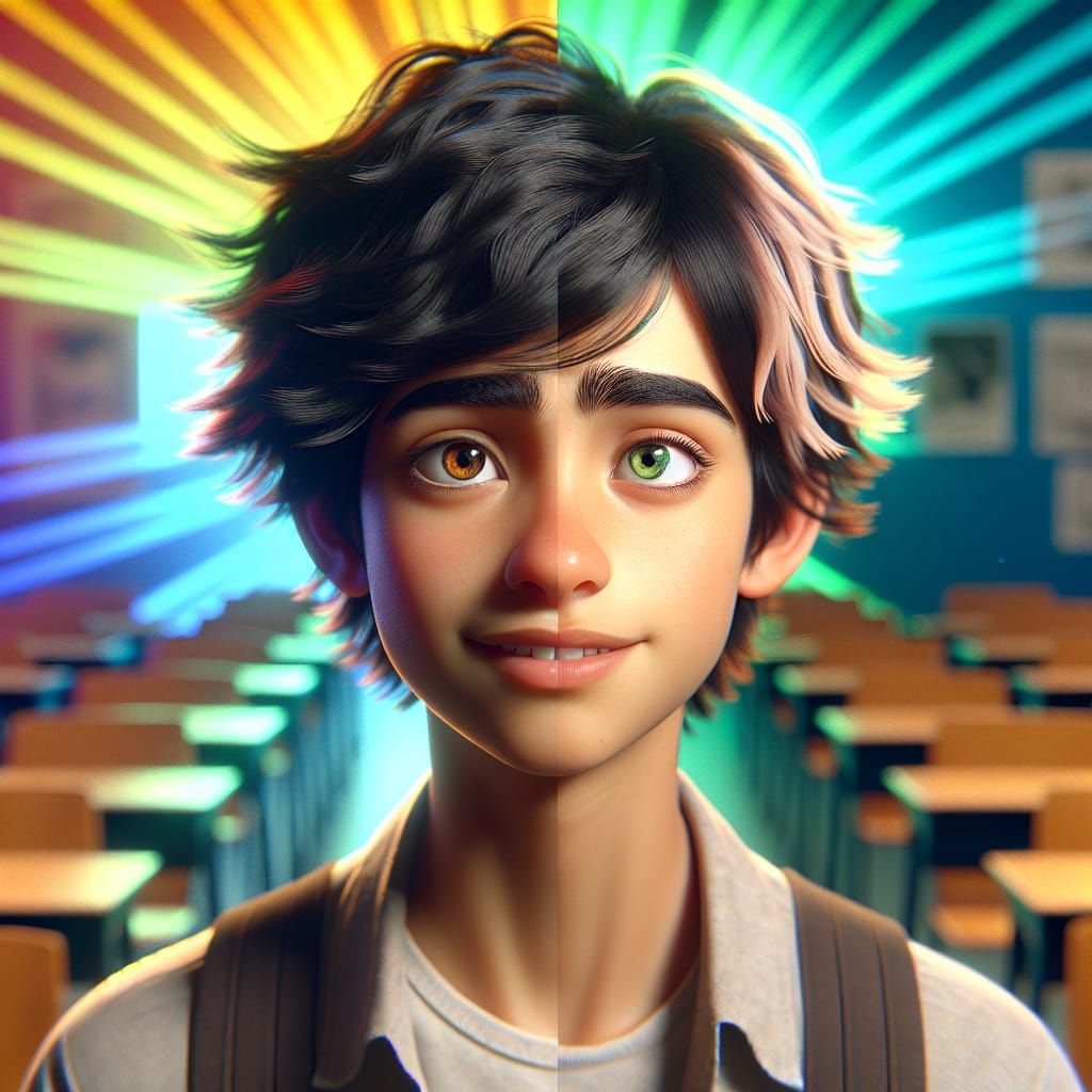 This image shows a fifteen-year-old boy of mixed Filipino and European heritage rendered as 3D digital art. The portrait captures his unique heterochromia and friendly expression in a vibrant, cinematic style. The artwork has 3D shading reminiscent of early 20th-century art.