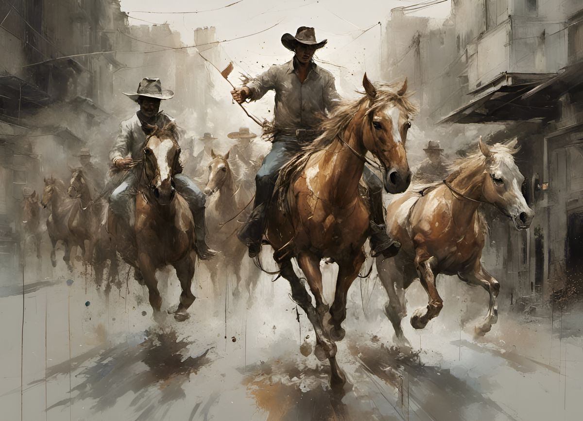 A dynamic speedpainting of cowboys on horseback charging through a deserted street. The artwork features textured brushstrokes, paint splatters, and ink details, capturing a sense of motion and energy.