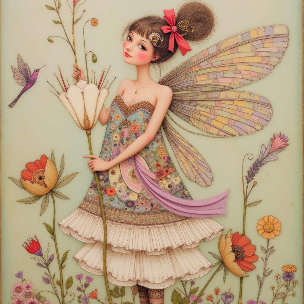 This image shows a steampunk fairy with clockwork wings perched on a white lily. The fairy's outfit includes flowing garments, ornate jewelry, and spiritual and mechanical elements in an art nouveau style.