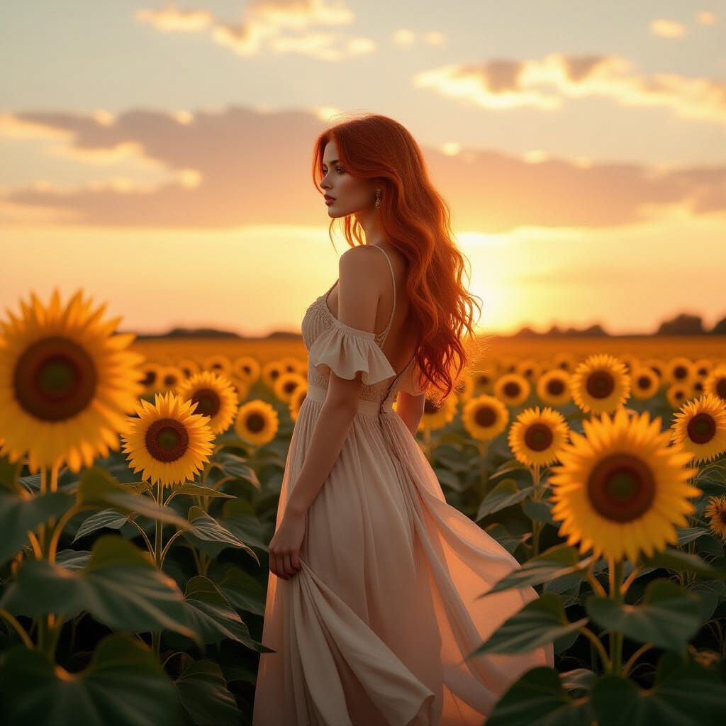 A stunning portrait of a red-haired woman in a sunflower field. Warm light and shallow depth of field create a cinematic feel, with a touch of surrealism and fantasy art.