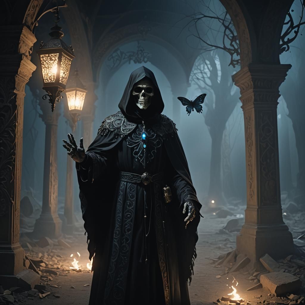 A cinematic image of a necromancer in a gothic setting. The figure stands in the shadows, cloaked in black robes with intricate patterns, holding a lantern casting eerie shadows in a dark fantasy art style.