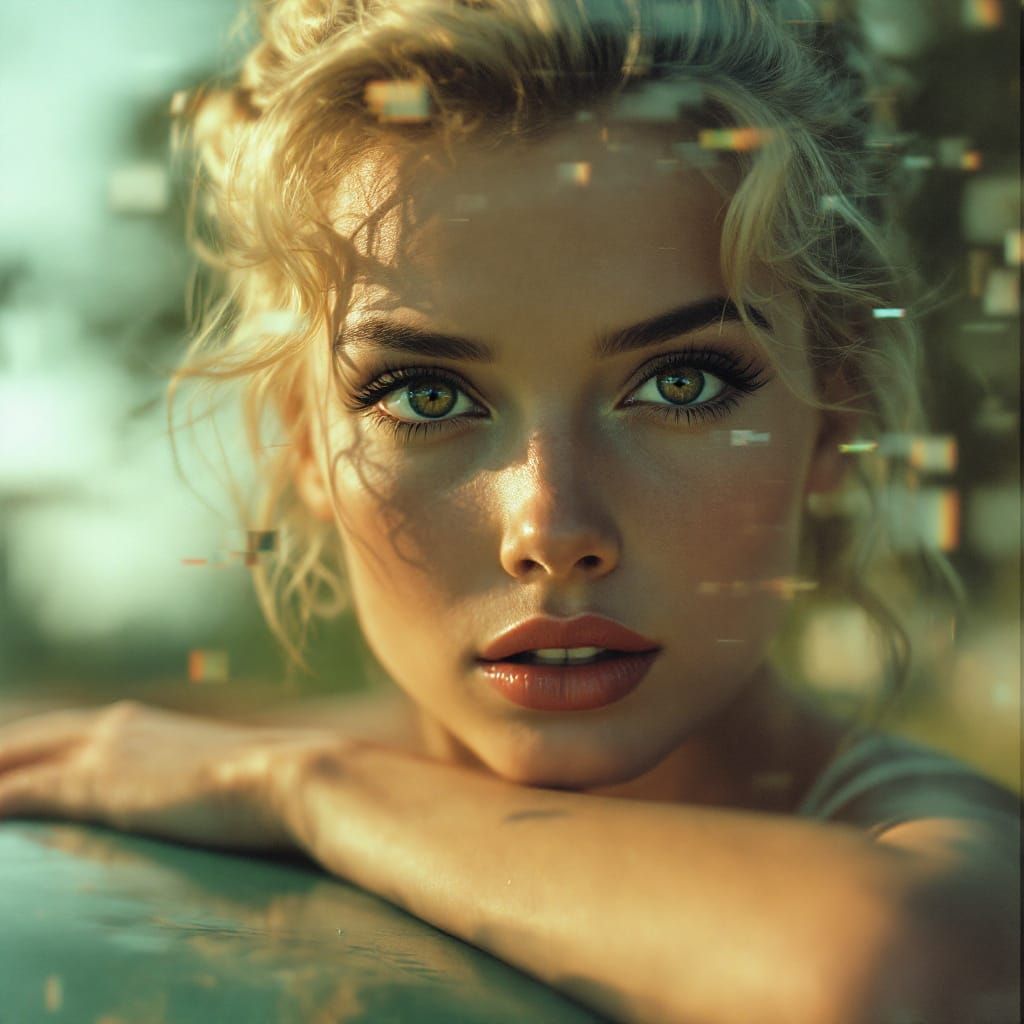 This image shows a 1950s pin-up woman in a summer outfit, with digital distortion and static effects creating a fragmented, communication breakdown aesthetic.