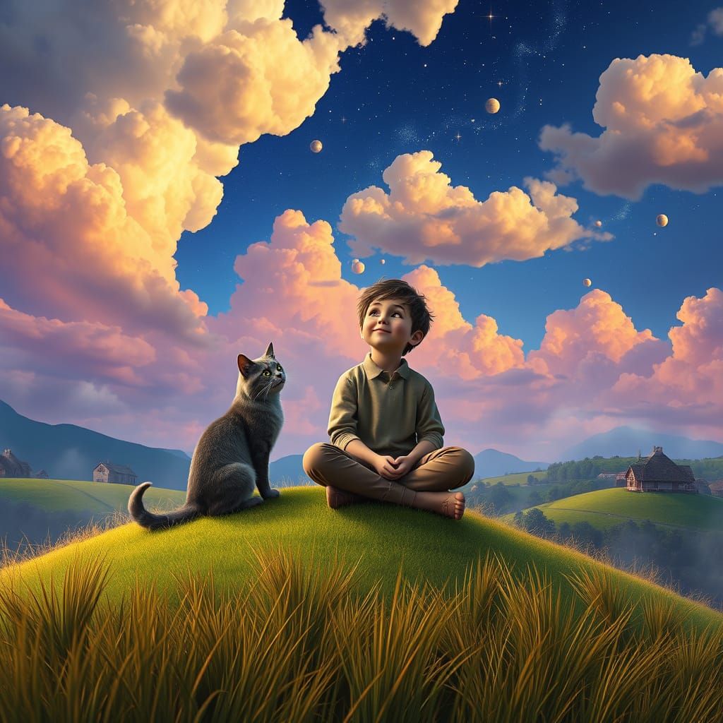 a young boy and a cat sit in quiet harmony on a hill overlooking a peacefully sleeping village as twilight fades; they gaze in wonder at a magical dreamy sky, twinkling dancing stars, vibrant clouds; whispered secrets float in the still air a masterpiece, 8k resolution, dark fantasy concept art, by Greg ...