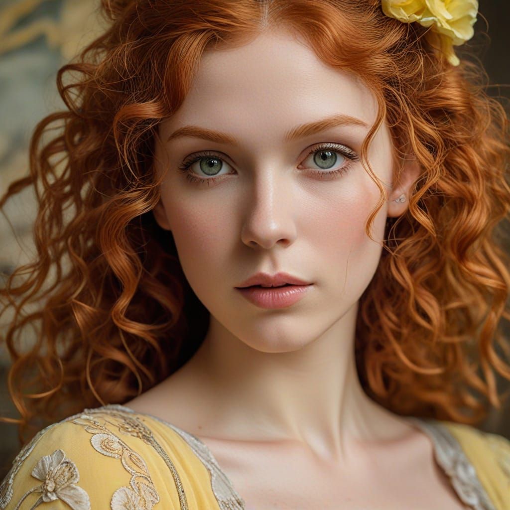 A portrait of a red-haired woman in a yellow dress, reminiscent of Art Nouveau style. The image features intricate floral details, soft, warm colors and golden light.