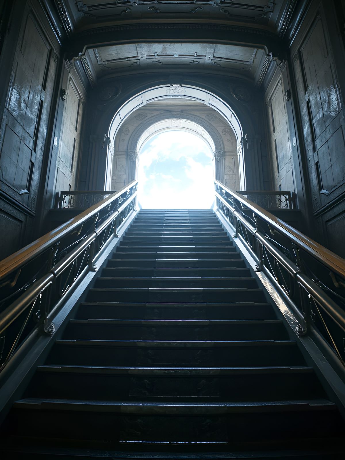 This image shows a breathtakingly detailed, 3D-rendered scene of a stairway leading to a glowing portal in a void. The scene is characterized by its intricate design, dynamic lighting, and cinematic feel, reminiscent of high-end 8K video game graphics.