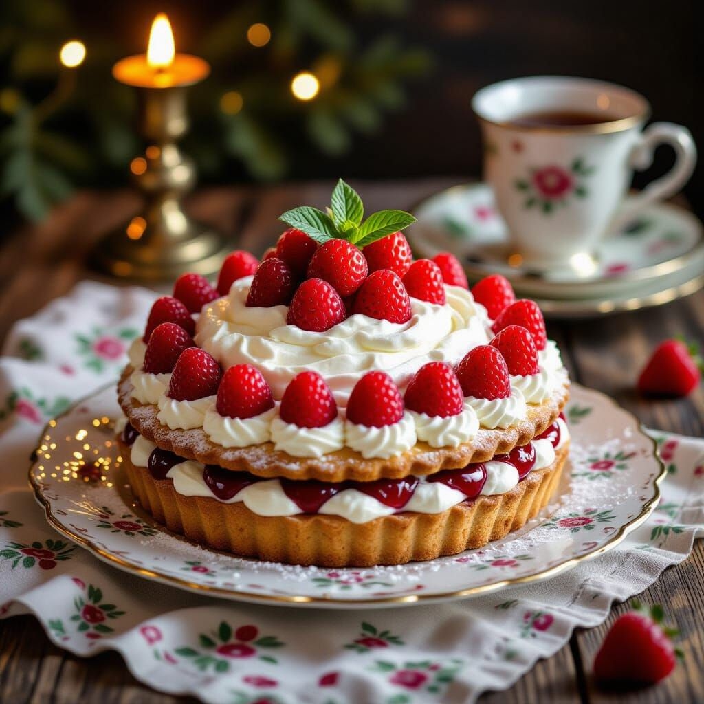 A scrumptious cake topped with strawberries, whipped cream and mint. The image showcases culinary portraiture with vibrant colors, textures and artistic still life composition.