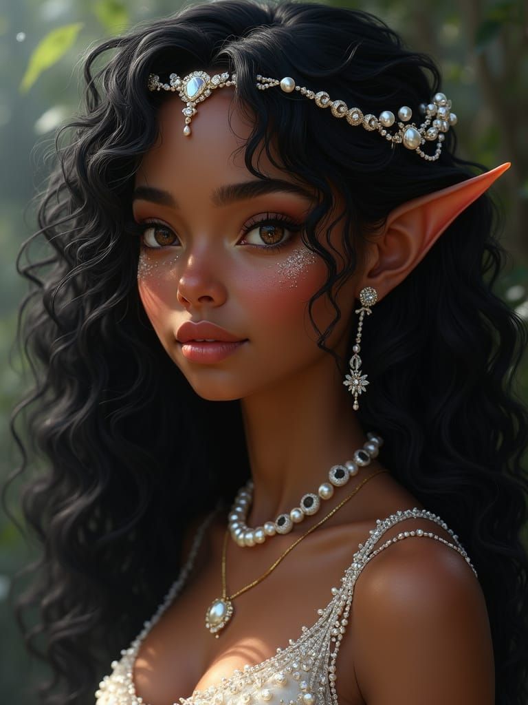 This image shows a stunning, photorealistic portrait of a beautiful elf with radiant skin, adorned with pearls and diamonds, shimmering eyes, and flowing black hair, set against a soft, ethereal glow, in a style reminiscent of hyper-realistic masterpieces.
