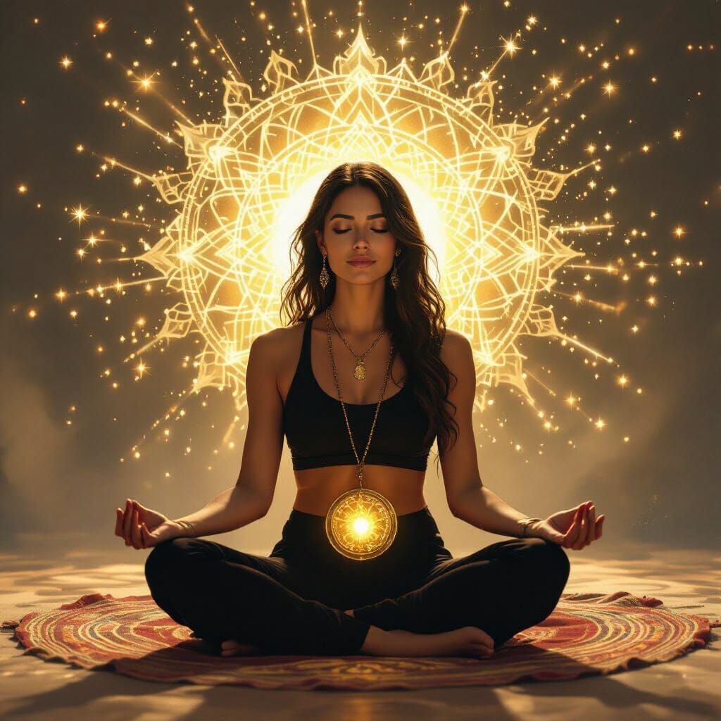 This image shows a woman in lotus position holding a singing bowl, bathed in golden light. The artwork evokes a spiritual atmosphere with soft lighting and serene composition.