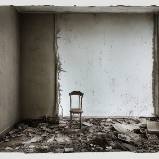 This image depicts a desolate environment filled with decay and emotional residue. A solitary figure embodies loss and isolation amidst muted tones and dim light, emphasizing profound sadness.