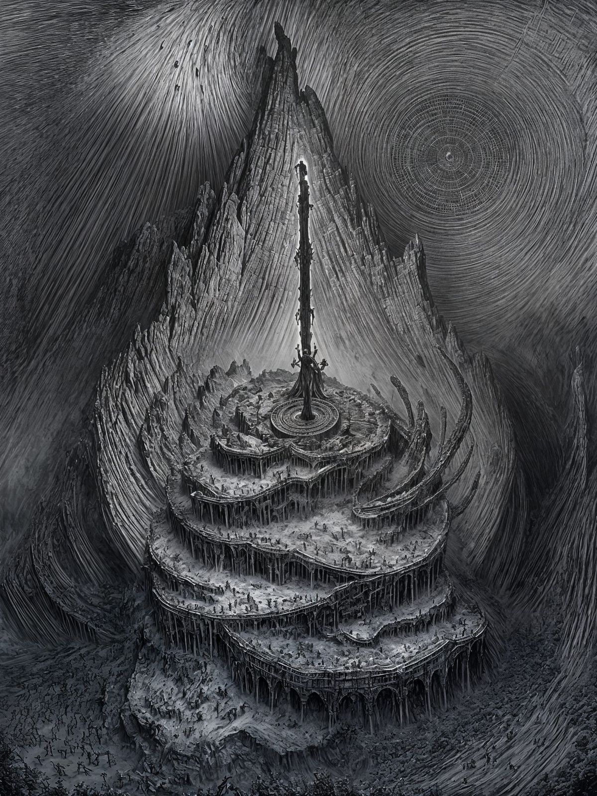 A black and white image inspired by Dante's Inferno. The scene, reminiscent of 19th-century illustrations, depicts a fantastical, horrifying landscape from the epic poem, showcasing giants and Lucifer.