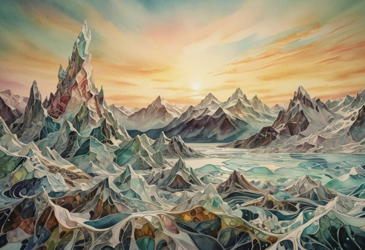 A striking picture of an icy mountain range and frozen lake. This fantastical landscape features dreamlike gouache swirls, intricate Zentangle patterns, and iridescent colors reminiscent of the aurora borealis.