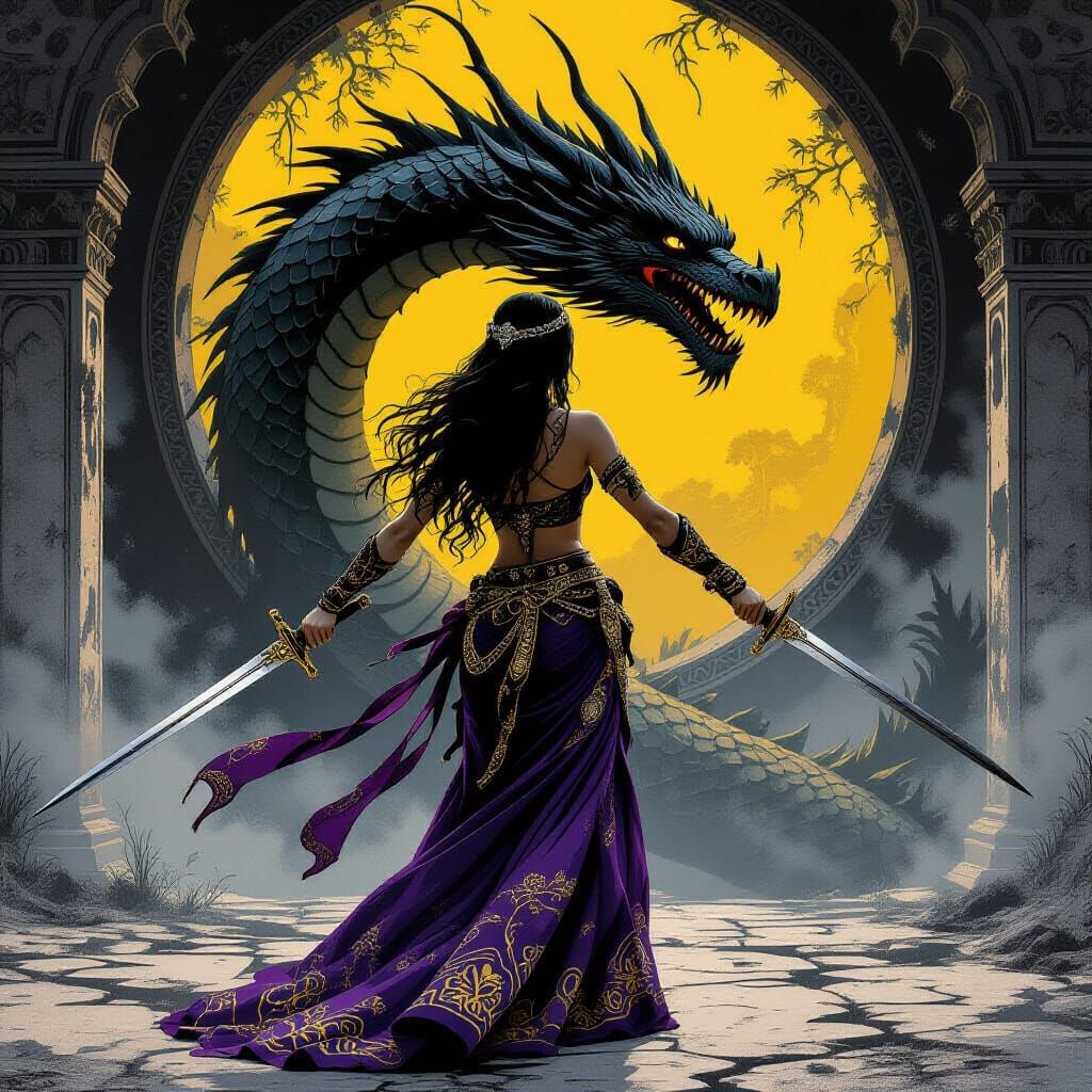 This image shows a gypsy dancer with swords, seen from behind, confronting a decaying dragon. The dark fantasy scene is rendered in monochrome with bold lines and dramatic shading, in the style of dark fantasy art.