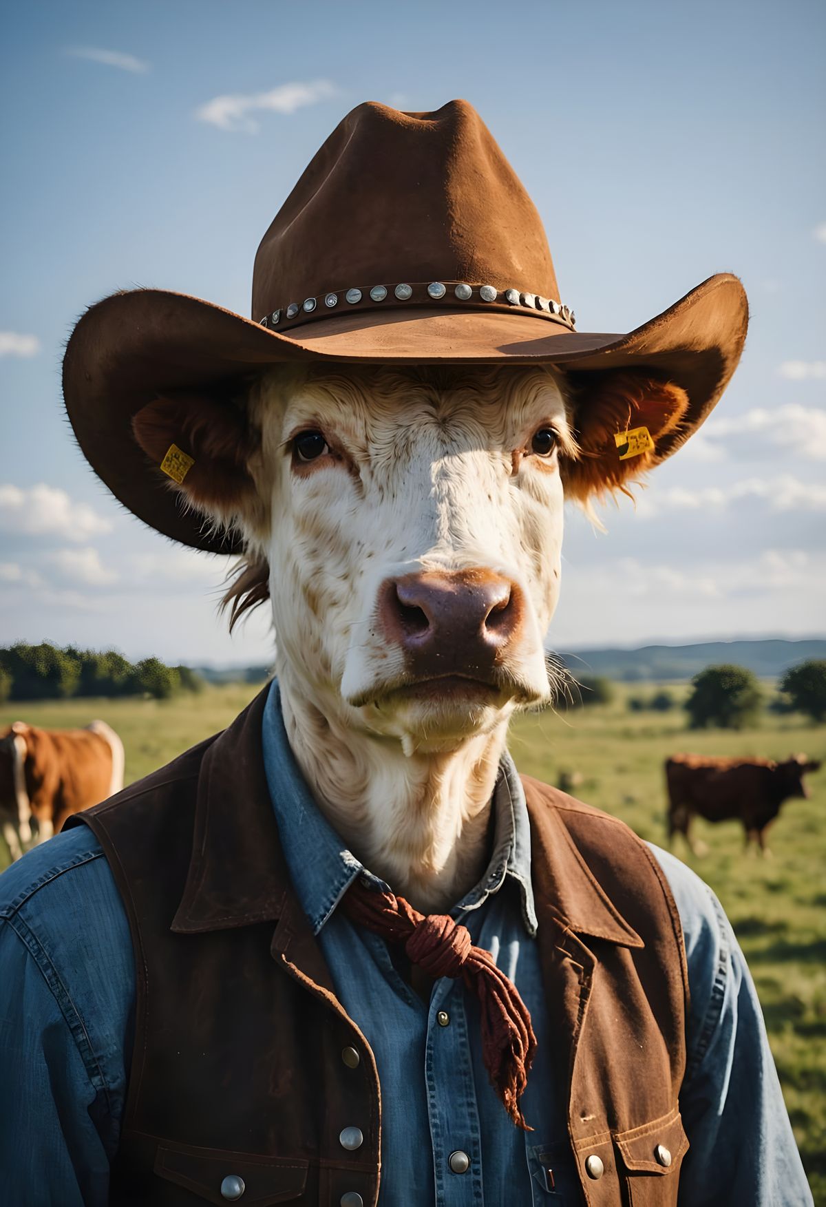 This image shows a portrait of a cow dressed as a cowboy. The artwork focuses on the cow's horns and portrays it in a humorous, anthropomorphic style.