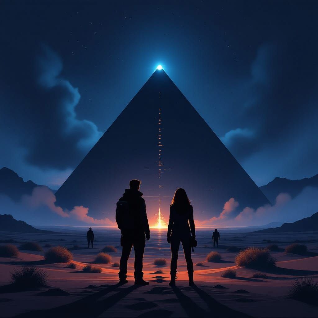 This image shows a dark and gritty futuristic scene of two figures standing back to back at a mysterious pyramid, surrounded by ominous shadows and mist, with a sense of government conspiracy lurking in the background, in a style reminiscent of cyberpunk and dystopian art