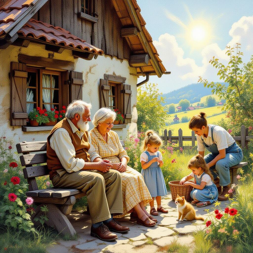 This oil painting shows an elderly couple holding hands, gazing lovingly at each other outside a cozy farmhouse. Their happy family enjoys the sunny day in the garden.
