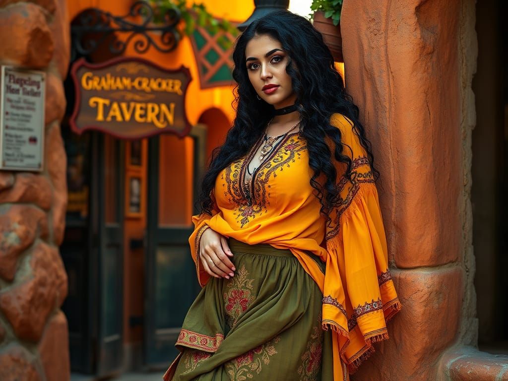 (a sign that says)(Graham-cracker Tavern) a beautiful gypsy woman huge bosom, leans casually against a cinnamon-stone alley outside Hansel&Gretel's graham-cracker tavern, looking beautiful in the tangerine sunset. Her extremely long pepper-black curls frame kohl-lined green eyes. She wears a flowing, ...