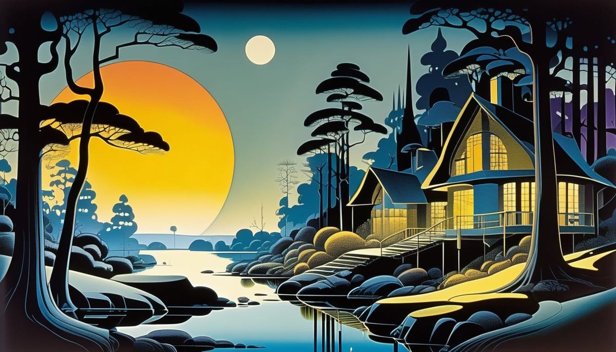 This image depicts a 19th-century cottage at dusk, rendered in a detailed hand-drawn digital illustration style reminiscent of retro D&D art, with cinematic lighting and reflective surfaces.