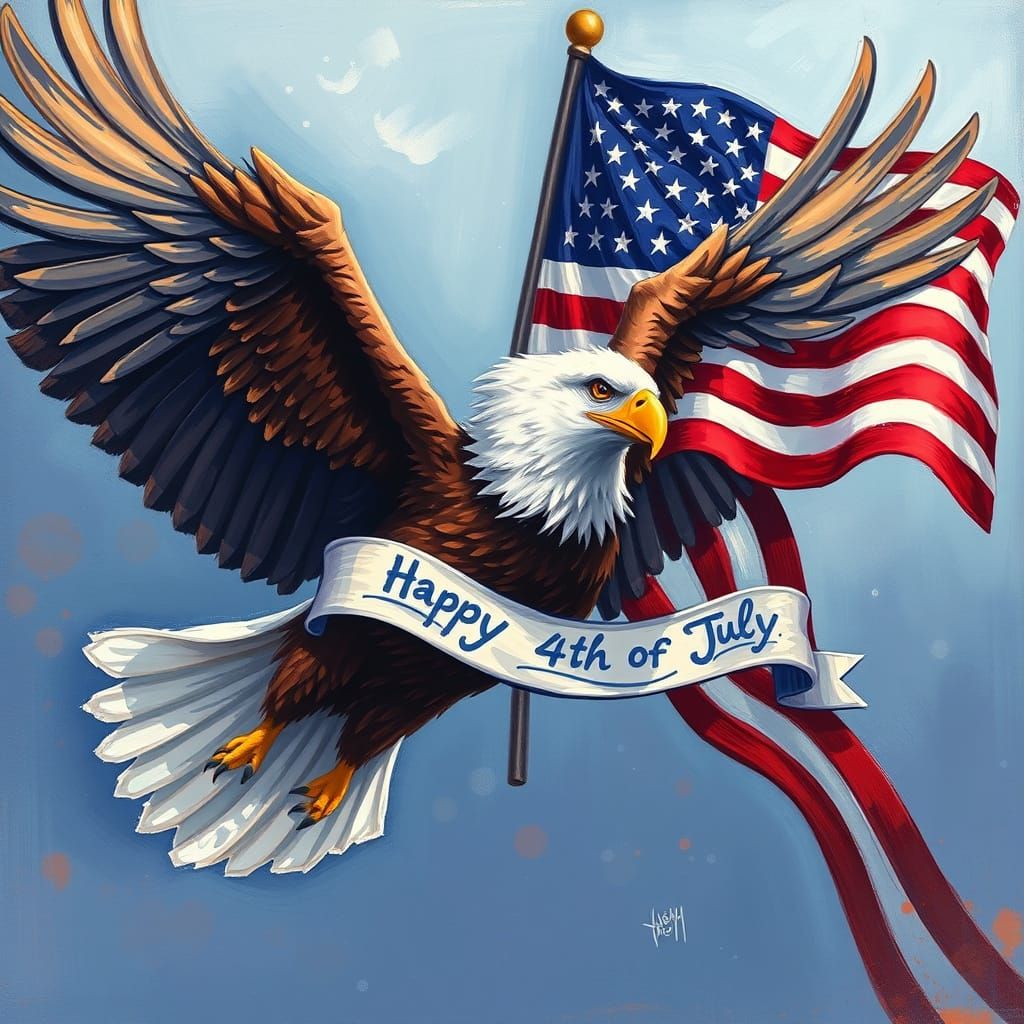 A majestic eagle soars, clutching an American flag alongside a festive 'Happy 4th of July' banner. This image captures a vibrant and highly detailed scene with dramatic lighting and expressive brushstrokes.