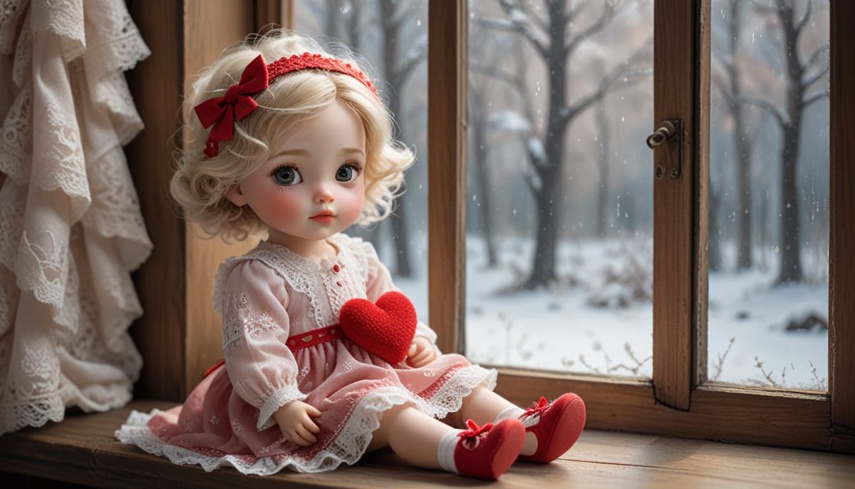 A charming illustration of a plump baby with blonde, curly hair, adorned with red bows and lace, holding a heart. The digital painting is set in a cozy winter scene with soft, diffused natural light.
