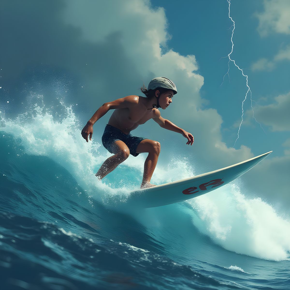 A digital artwork showing a stormy seascape with surfers riding large waves. The scene evokes themes of courage and resilience in the face of adversity.